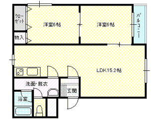 | 詳細間取 | 2LDK (洋6帖×1、洋6.5帖×1、LDK15.2帖) | ||